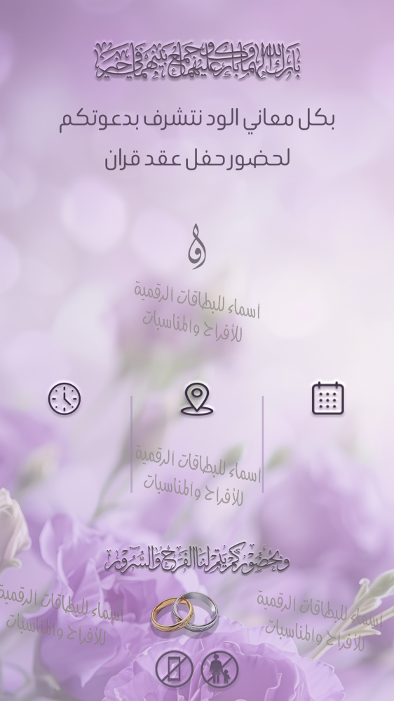 نقدم لكم تصميم دعوة إلكترونية لعقد القران بلمسة أنيقة وهادئة باللون البنفسجي، مثالي لمشاركتها عبر الواتساب.